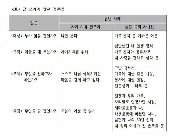 ‘내 인생의 연대표’를 그리며 스스로 관조하다 보면 인생의 희비에 숨겨진 의미를 통찰하게 된다. 그렇다면 이제 ‘나는 이 글을 왜 써야 하는가’에 대해 생각해야 한다. 많은 이들이 종종 ‘내 인생을 책으로 쓰면 열 권은 나온다’, ‘나도 내 인생을 책으로 내고 싶다’는 희망을 드러낸다. 그럴 때 나는 묻고 싶다. 왜?