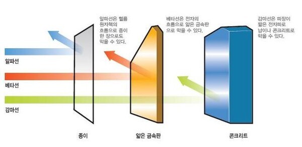 방사선은 크게 알파(α)선·베타(β)·감마(γ)선 세 종류로 나뉜다. 알파(α)선은 입자가 커서 대부분 물질을 잘 통과하지 못해 신체에 큰 영향을 미치지 못한다. 베타(β)선 또한 입자 형태로 방사된다. 알파선보다는 에너지가 높아 종이 정도는 통과할 수 있지만, 금속판과 같은 물질은 통과하지 못한다.