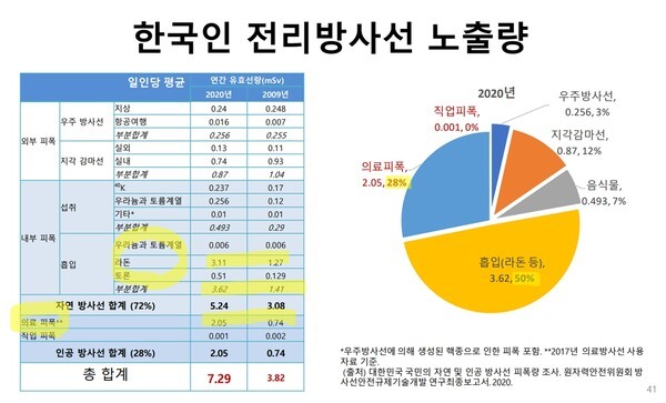 2020년 원자력안전위원회가 제작한 《대한민국 국민의 자연 및 인공방사선 피폭량 조사》 자료집에 따르면, 한국 국민의 연간 평균 방사선 피폭량은 7.29mSv/year였다. 그중 땅·음식·햇빛과 라돈 흡입 등 자연 방사선에 의한 내・외부 피폭량은 5.24mSv/year, 의료기기 등 인공 방사선에 의한 피폭량은 2.05mSv/year였다.