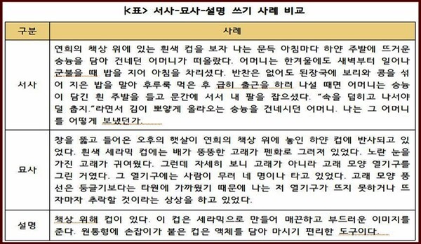 서사가 시간을 기준으로 상황을 전달하고 의미를 되새기는 방식이라면 묘사는 그림처럼 공간과 풍경을 그리는 것과 비슷하다.